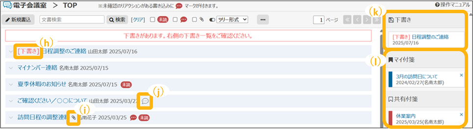ツリー形式、日付順、チャット形式に切り替えできます。