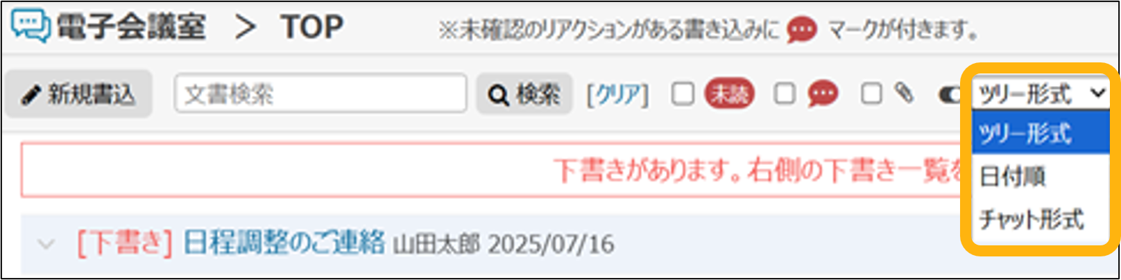 ツリー形式、日付順、チャット形式の3つから表示形式を選択できます。
