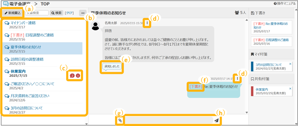 親文書と返信を吹き出しで表示できます。