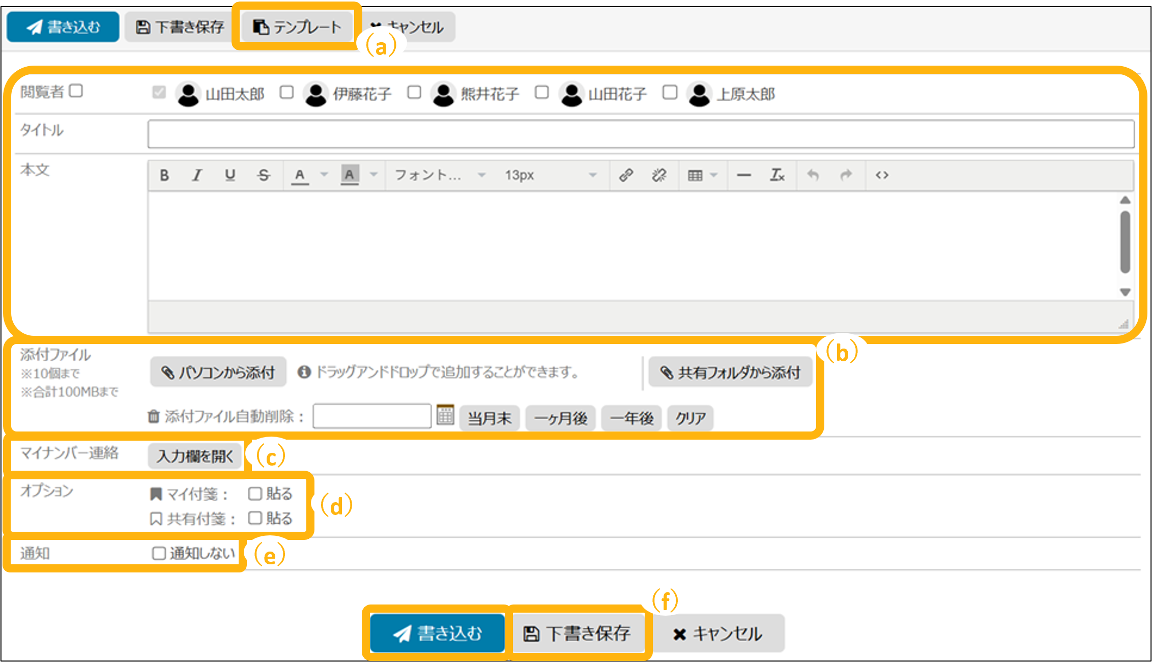 ※マイナンバー連絡、マイ付箋、共有付箋は下書き保存できません。