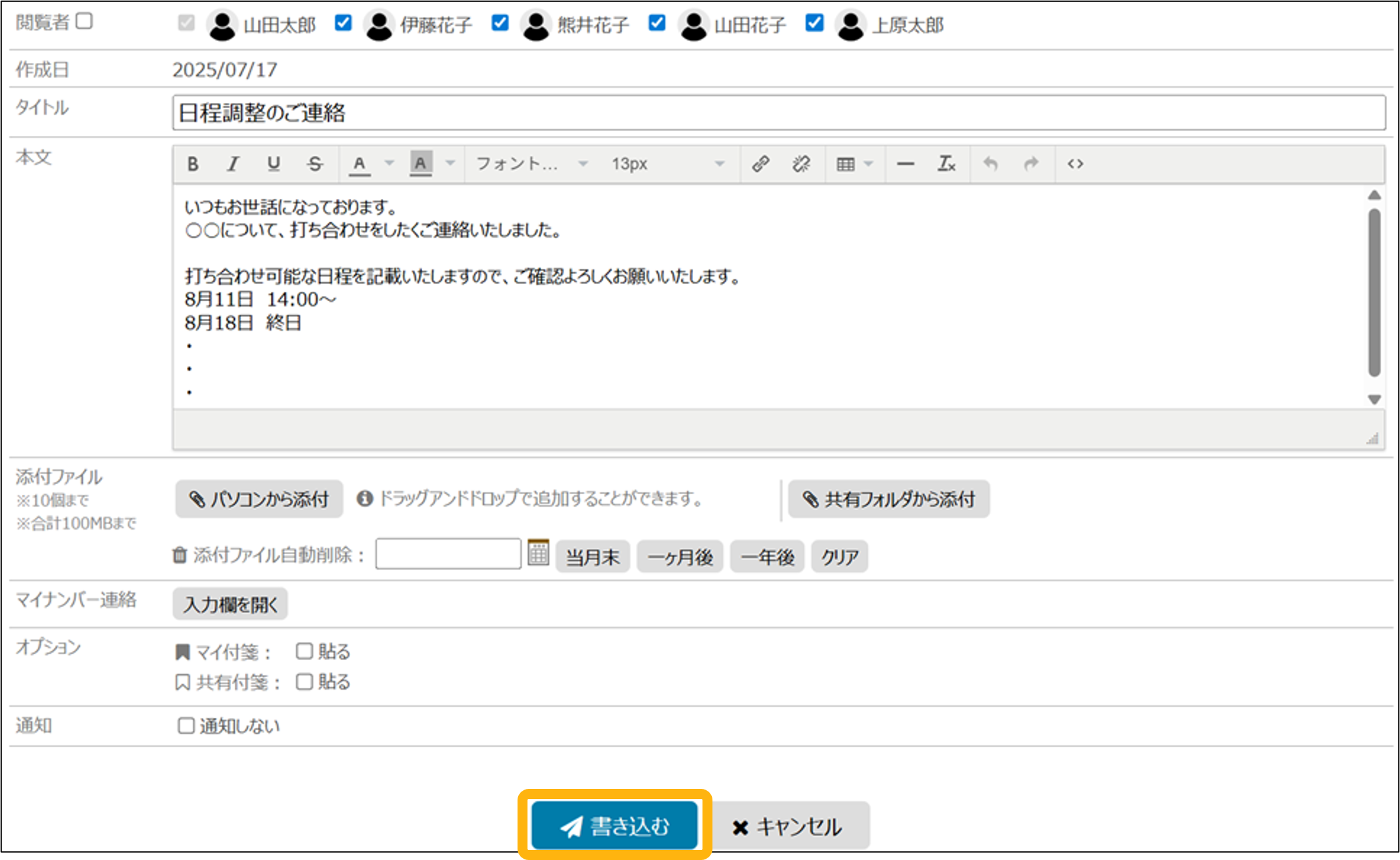 ③閲覧者を選択し、タイトル、本文を入力