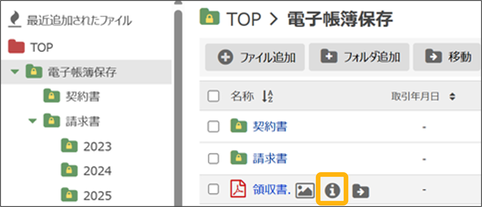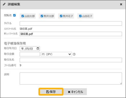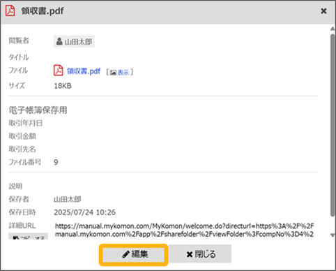 目次 TOP 共有フォルダマニュアル 電子帳簿保存フォルダ編 はじめに ご利用にあたって システム概要 画面紹介 電子帳簿保存フォルダ/画面紹介 フォルダ・ファイル フォルダ(追加・編集・削除) ファイル追加 ファイルの表示 詳細の編集 閲覧者の一括追加 管理 電子帳簿保存フォルダ内検索 移動・一括移動 ダウンロード ファイル情報エクスポート 詳細の編集 ファイルの詳細を編集できます。 ※ファイル番号、保存日時の変更はできません。 ①「共有フォルダ」をクリック ➁「電子帳簿保存」をクリック ➂ファイルにカーソルを合わせ、アイコンをクリック ④「編集」をクリック ⑤必要な項目を編集し、「保存」をクリック ※メール通知はされません。 詳細の編集が完了しました。 このページを印刷する