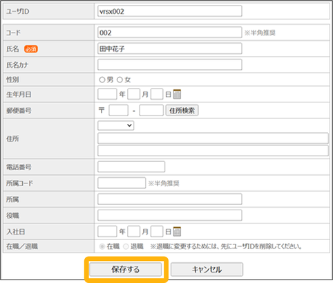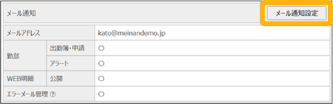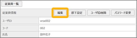 従業員マスタ管理 従業員マスタ管理マニュアル 目次 TOP 従業員マスタ管理マニュアル 初期設定 従業員登録 ID発行・メニュー設定 従業員管理 従業員情報の確認・修正 部下設定 パスワード変更 従業員IDの削除 従業員追加・ID発行 メニュー設定 エラーメール管理 利用状況確認 従業員情報の確認・修正 従業員情報の確認・修正ができます。 ①「従業員マスタ管理」をクリック ②「従業員一覧」をクリック ③氏名をクリック ④「編集」をクリック ⑤必要な項目を確認・修正し、「保存する」をクリック 従業員情報の確認・修正が完了しました。 メール通知 メール通知の設定を変更できます。 従業員一覧から氏名を選択後、「メール通知設定」をクリックし設定を変更してください。 このページを印刷する