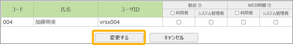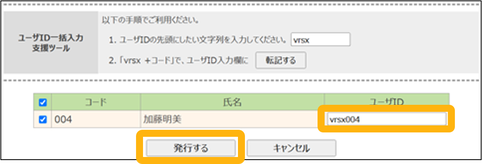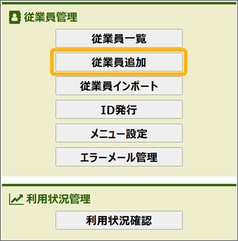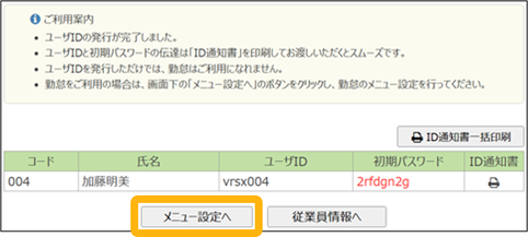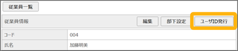 従業員マスタ管理 従業員マスタ管理マニュアル 目次 TOP 従業員マスタ管理マニュアル 初期設定 従業員登録 ID発行・メニュー設定 従業員管理 従業員情報の確認・修正 部下設定 パスワード変更 従業員IDの削除 従業員追加・ID発行 メニュー設定 エラーメール管理 利用状況確認 従業員追加・ID発行 従業員を追加し、従業員IDを発行します。 ①「従業員マスタ管理」をクリック ②「従業員追加」をクリック ③従業員情報を入力し、「保存する」をクリック ④「ユーザID発行」をクリック ⑤ユーザIDを入力し、「発行する」をクリック ⑥「メニュー設定へ」をクリック ⑦利用するメニューを選択し、「変更する」をクリック ⑧「変更を確定する」をクリック 従業員追加・ID発行が完了しました。 このページを印刷する