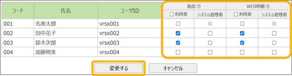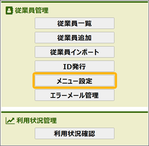 従業員マスタ管理 従業員マスタ管理マニュアル 目次 TOP 従業員マスタ管理マニュアル 初期設定 従業員登録 ID発行・メニュー設定 従業員管理 従業員情報の確認・修正 部下設定 パスワード変更 従業員IDの削除 従業員追加・ID発行 メニュー設定 エラーメール管理 利用状況確認 メニュー設定 利用するメニューの設定を変更できます。 ①「従業員マスタ管理」をクリック ②「メニュー設定」をクリック ③メニュー設定を変更し、「変更する」をクリック ④「変更を確定する」をクリック メニュー設定が完了しました。 このページを印刷する