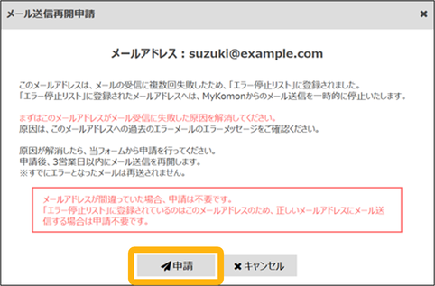 メールアドレスの登録間違い以外が原因の場合は、原因を解消した後、「申請する」をクリックし、以下フォームより申請を行ってください。