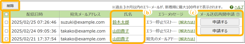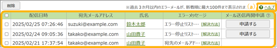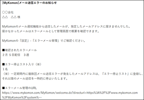一定期間に複数回のメール送信エラーが発生したメールアドレスは、「エラー停止リスト」に登録され、それ以降のメール送信が一時的に停止されます。