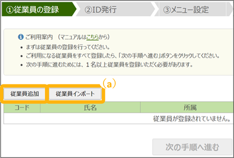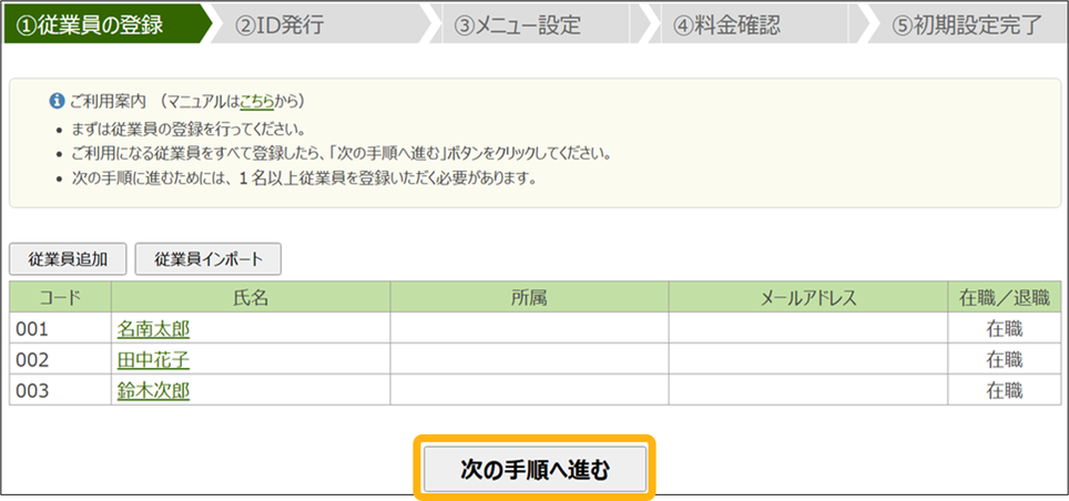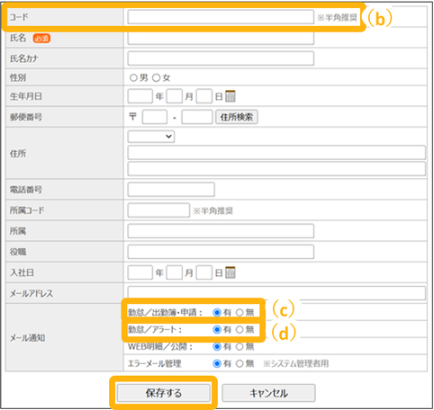 勤怠管理や、WEB明細を利用する従業員を登録します。