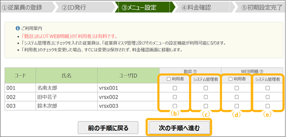 ユーザIDを発行しない従業員はチェックを外してください。