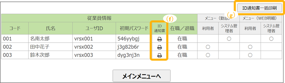 従業員情報登録後、従業員IDの発行とメニュー設定をします。