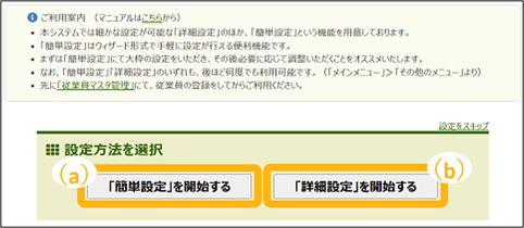 勤怠管理 管理者編 目次 管理者編 TOP 勤怠管理マニュアル 管理者編 初期設定 基本設定 勤務形態 曜日別の勤務形態 従業員別設定 労働時間集計設定 年間カレンダー 有休付与管理 有休付与設定 有休付与管理(有休付与) 有休付与管理の仕様 共用端末打刻設定 管理 時間外労働管理/画面紹介 有休取得管理/画面紹介 勤務実績ダウンロード 出勤簿ダウンロード 有休管理簿印刷ツールのダウンロード 2025年04月16日(水)更新 勤怠管理マニュアル 管理者編 このマニュアルでは、勤怠管理システム利用開始前に必要な設定をご案内します。 ※これからご案内する設定は、管理者にて行うことができます。 (a)簡単設定 ウィザード形式で手軽に初期設定を行うことができます。 画面の案内に沿って設定を進めてください。 (b)詳細設定 勤怠の設定を1つずつ細かく設定できます。 詳細は、次のページ以降をご覧ください。 一緒に見られているマニュアル 従業員マスタ管理マニュアル 勤怠管理マニュアル 利用者編 このページを印刷する