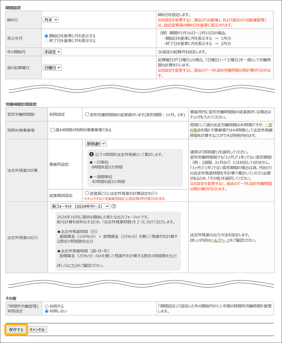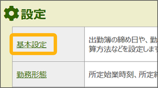 基本設定では、出勤簿の締め日や勤務区分の選択肢などを設定します。