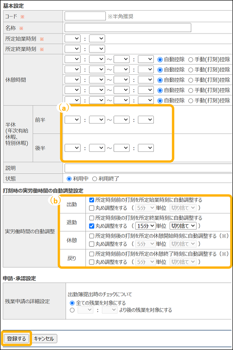 基本設定の「勤務区分:半休」にチェックを入れた場合のみ、設定できます。
