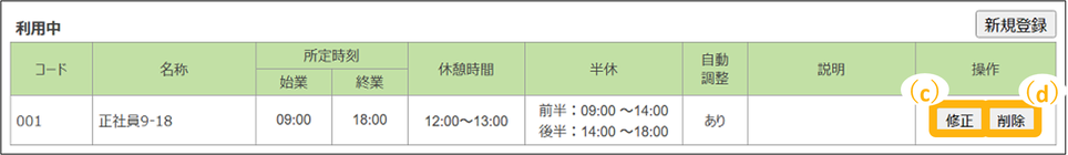 ※既に出勤簿で利用している勤務形態は、「所定始業時刻」「所定終業時刻」「休憩時間」「半休」の変更ができません。