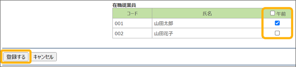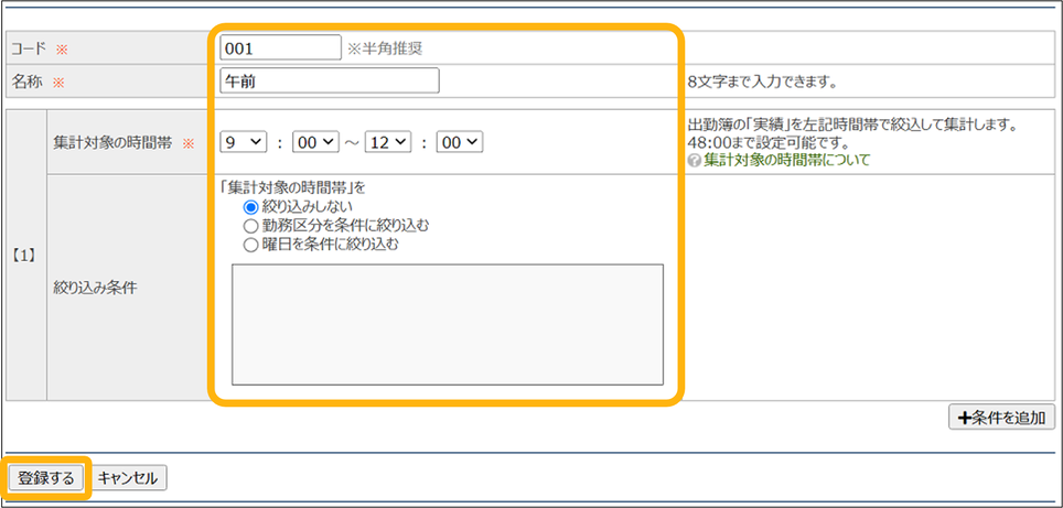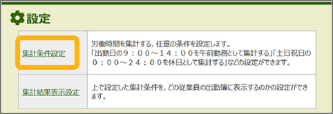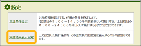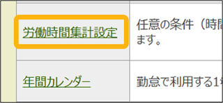 勤怠管理 管理者編 目次 管理者編 TOP 勤怠管理マニュアル 管理者編 初期設定 基本設定 勤務形態 曜日別の勤務形態 従業員別設定 労働時間集計設定 年間カレンダー 有休付与管理 有休付与設定 有休付与管理(有休付与) 有休付与管理の仕様 共用端末打刻設定 管理 時間外労働管理/画面紹介 有休取得管理/画面紹介 勤務実績ダウンロード 出勤簿ダウンロード 有休管理簿印刷ツールのダウンロード 労働時間集計設定 任意の条件(時間帯、勤務区分、曜日)で労働時間を集計できます。 ①「勤怠」をクリック ②「その他のメニュー」をクリック ③「労働時間集計設定」をクリック ④「集計条件設定」をクリック ⑤「新規登録」をクリック ⑥「集計条件」を設定し、 「登録する」をクリック ⑦「集計結果表示設定」をクリック ⑧「編集」をクリック ⑨④で登録した集計条件を従業員ごとに設定し、「登録する」をクリック 労働時間集計設定が完了しました。 このページを印刷する