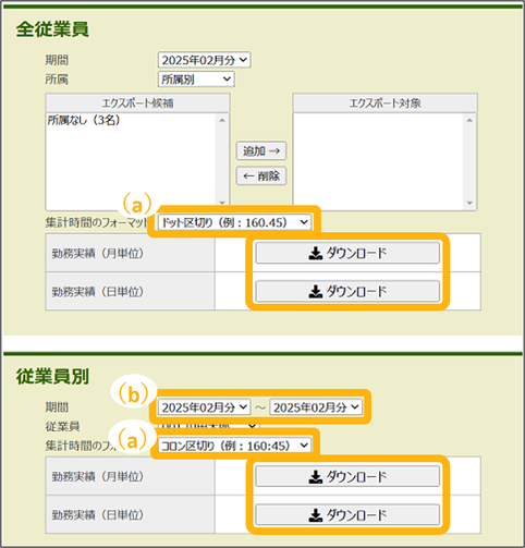 勤怠管理 管理者編 目次 管理者編 TOP 勤怠管理マニュアル 管理者編 初期設定 基本設定 勤務形態 曜日別の勤務形態 従業員別設定 労働時間集計設定 年間カレンダー 有休付与管理 有休付与設定 有休付与管理(有休付与) 有休付与管理の仕様 共用端末打刻設定 管理 時間外労働管理/画面紹介 有休取得管理/画面紹介 勤務実績ダウンロード 出勤簿ダウンロード 有休管理簿印刷ツールのダウンロード 勤務実績ダウンロード 勤務実績をダウンロードできます。 ①「勤怠」をクリック ②「その他のメニュー」をクリック ③「勤務実績」をクリック ④条件を指定して、「ダウンロード」をクリック (a)集計時間のフォーマット ドット区切りとコロン区切りから選択できます。 <例>7時間45分 ドット⇒7.45 コロン⇒7:45 (b)期間 従業員別は、最大1年分をダウンロードできます。 勤務実績ダウンロードが完了しました。 このページを印刷する