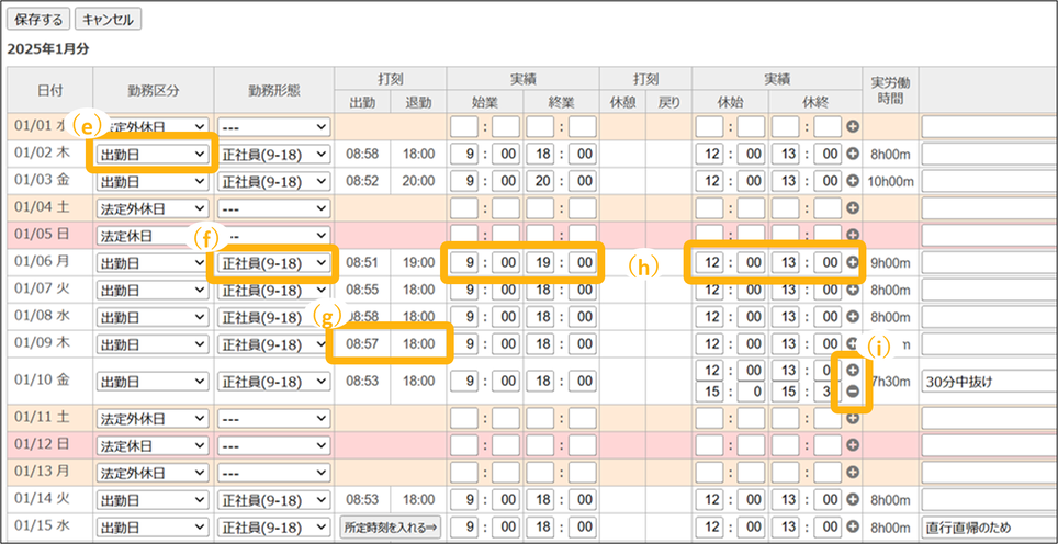 また、打刻時刻と実際の勤務実績が異なる場合は、ここで変更することもできます。