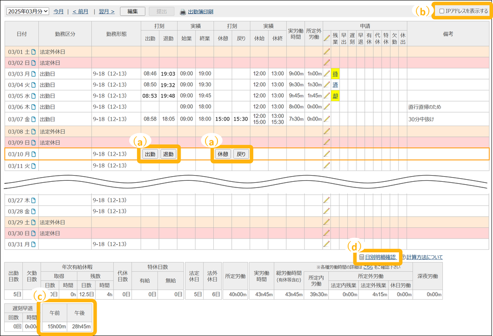 労働時間の集計結果を、日別ごとに確認できます。