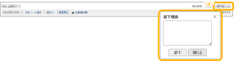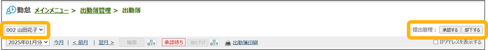 提出済みの出勤簿には、「承認する」「却下する」が表示されます。