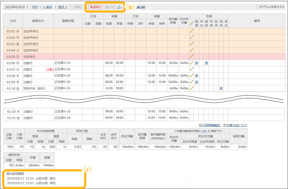 ※出勤簿提出時の制御を「許可する」の状態、かつ「承認待ち」の残業や有休等の申請がある状態で出勤簿を承認すると、「承認待ち」の申請はすべて「承認済み」になります。