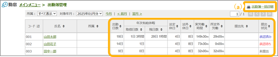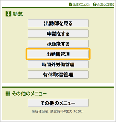 ※管理者でない従業員でも部下設定している場合は、「出勤簿管理」が表示され、部下の出勤簿の状況を確認できます。