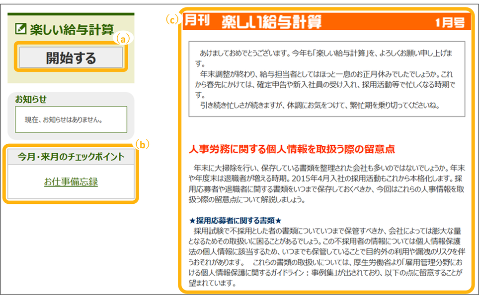楽しい給与計算 導入編 目次 導入編 TOP 楽しい給与計算マニュアル 導入編 初期設定 TOP/画面紹介 事業所情報の登録 従業員の登録 開始月の給与計算 その他 アラート 勤怠連動 勤怠連動について 事業所情報の連動設定 従業員情報の連動設定 勤怠連動ありの給与計算 勤怠連動ありの給与の修正 法定外残業の分割について TOP/画面紹介 楽しい給与計算TOPの画面紹介です。 ①「楽しい給与計算」をクリック (a)開始する こちらから給与計算を開始します。 (b)今月・来月のチェックポイント 今月・来月に注意していただきたい、給与を中心とした情報です。 忘れてしまいがちなポイントがしっかりと押さえられています。 (c)月刊楽しい給与計算 毎月のタイムリーな情報を発信しています。 関連情報へのリンクもご用意しております。 このページを印刷する