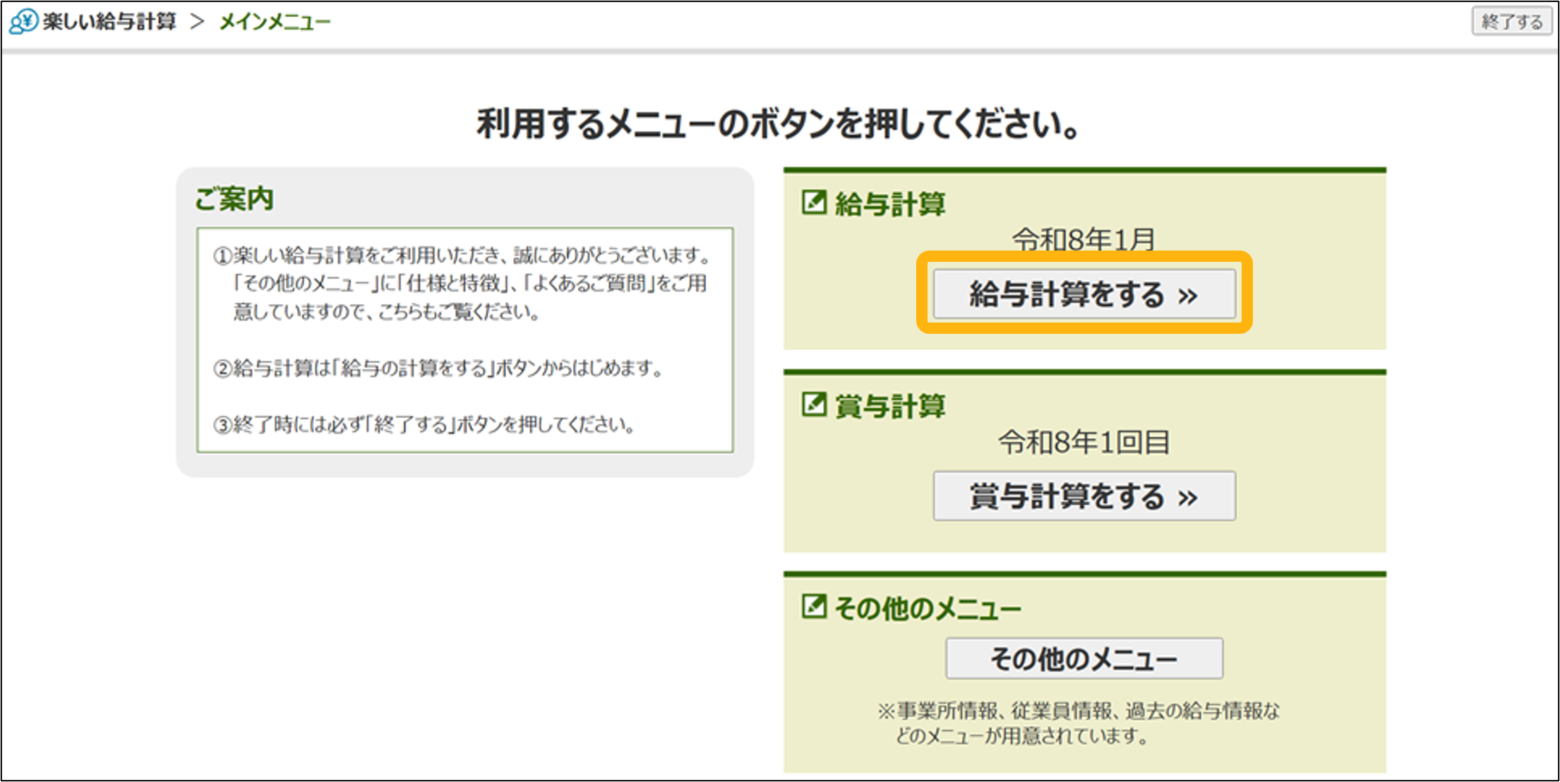 ②「給与計算をする」をクリック