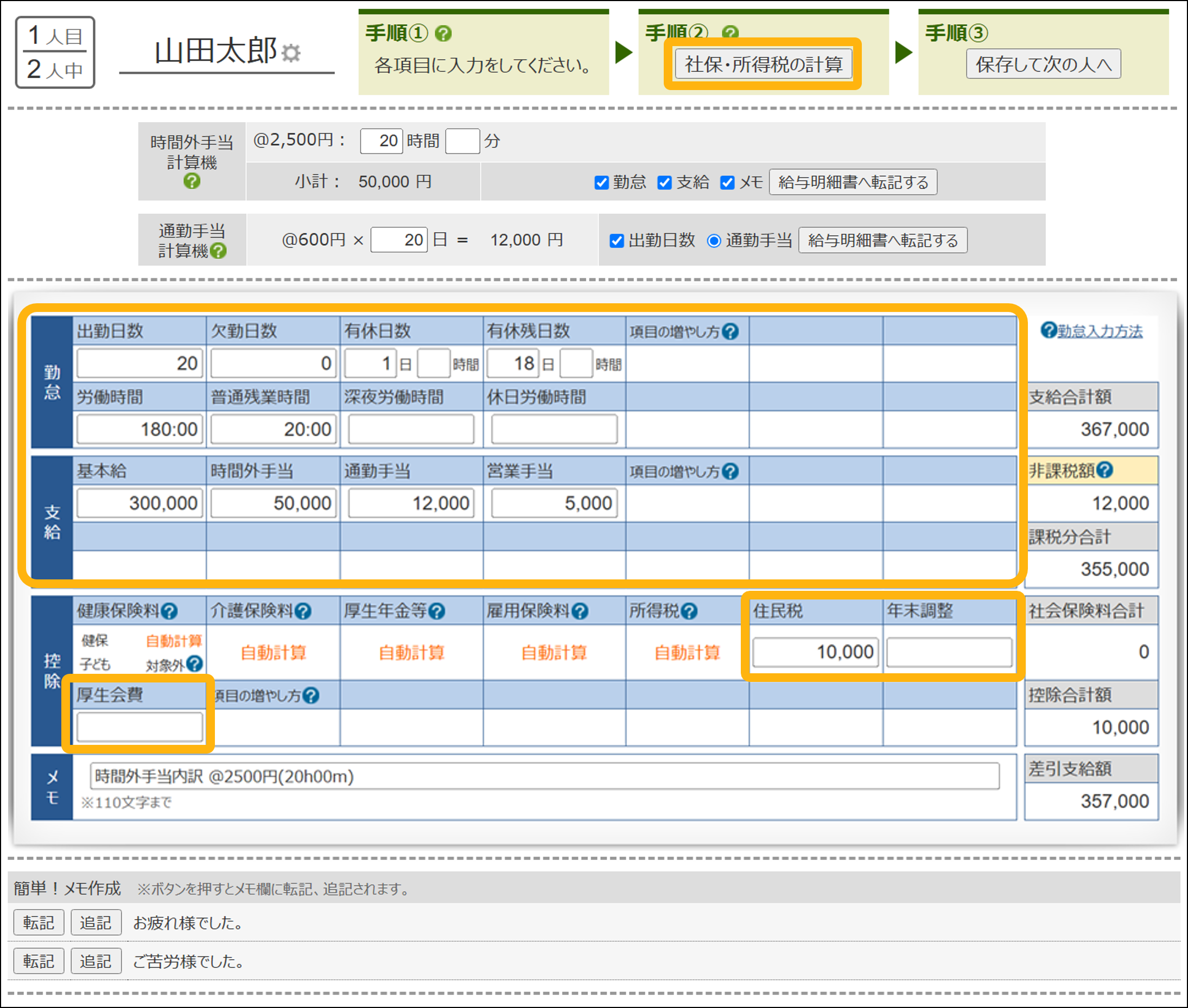 ⑤勤怠・支給など、必要な項目を入力し、「社保・所得税の計算」をクリック