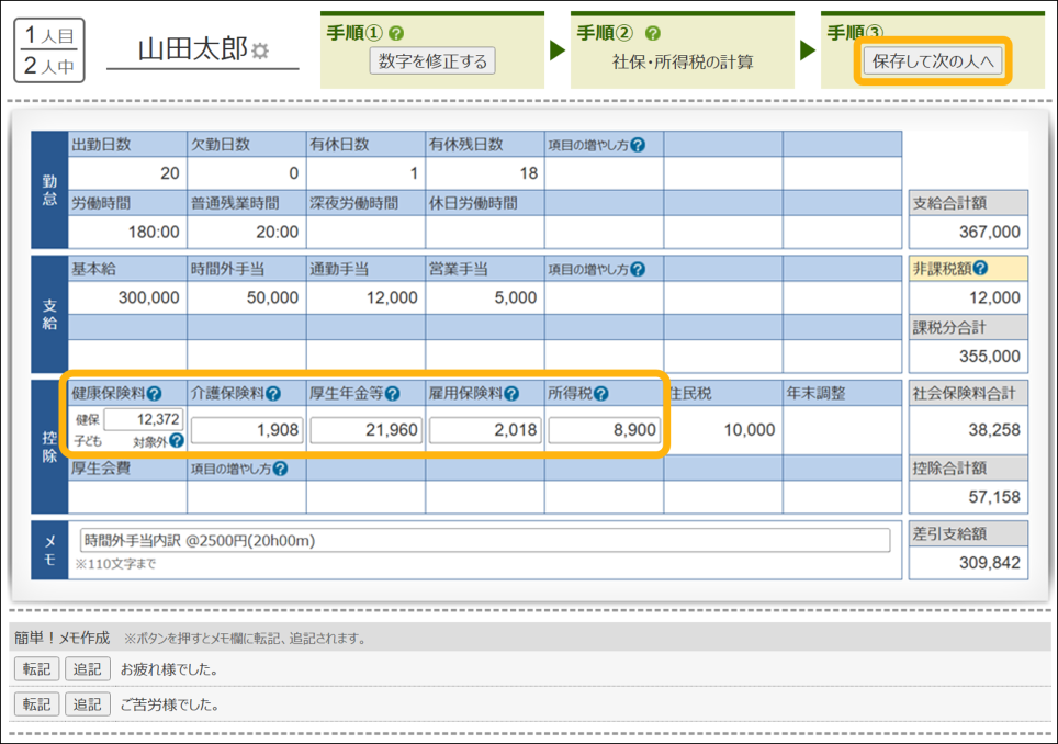次の従業員の給与計算へ移動します。人数分⑤と⑥を繰り返してください。