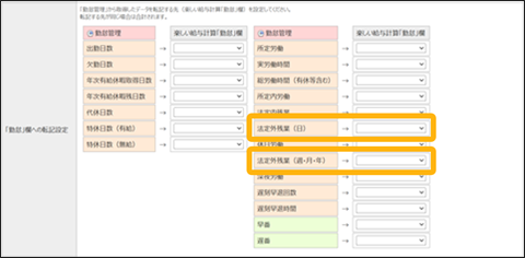 事業所情報の「給与の項目名」で登録した「勤怠」項目へ、転記先を設定できます。