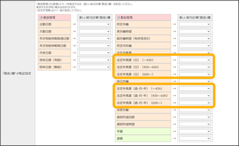 法定外残業を「45時間まで」「45時間から60時間まで」「60時間以上」に分けて、集計・計算をするか選択できます。