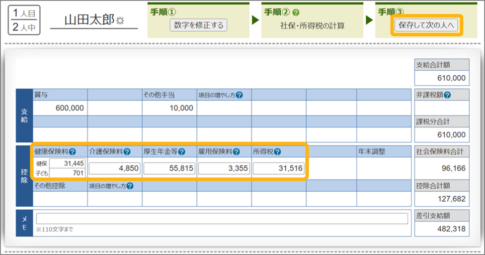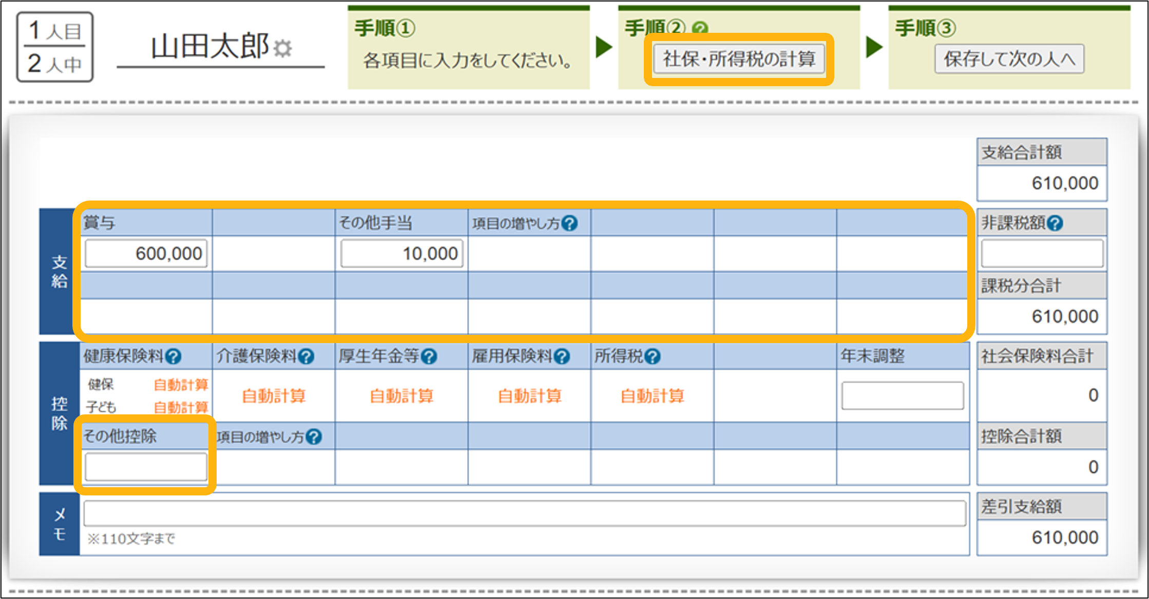 ⑥必要な項目を入力し、「社保・所得税の計算」をクリック