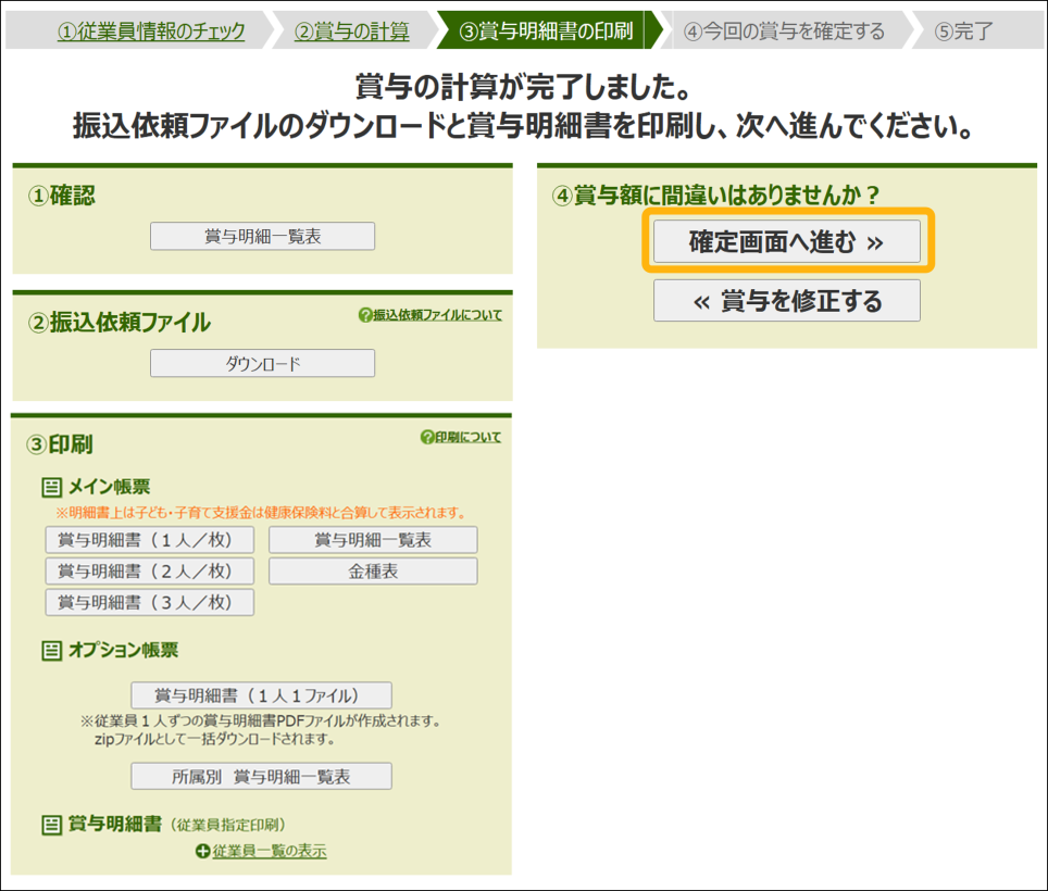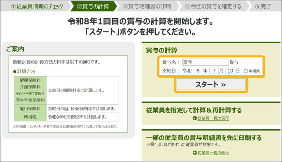 ⑤賞与名・支給日を確認し、「スタート」をクリック