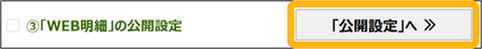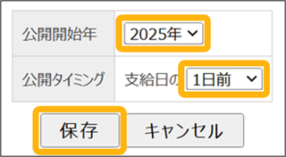 WEB明細・PDF帳票 WEB明細・PDF帳票マニュアル 目次 TOP WEB明細・PDF帳票マニュアル 初期設定 楽しい給与計算の初期設定 従業員マスタ管理の初期設定 公開設定 公開処理 公開予約 公開予約 PDF帳票 PDF帳票の登録&配布 確認方法 WEB明細の確認 公開設定 「「WEB明細」の公開設定」を行います。 ①「「公開設定」へ」をクリック ➁公開開始年と公開タイミングを選択し、「保存する」をクリック 公開タイミングは、土日祝日を考慮しません。 公開設定が完了しました。 このページを印刷する