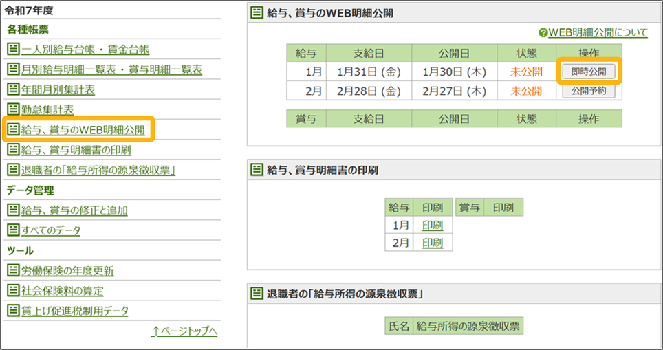 WEB明細・PDF帳票 WEB明細・PDF帳票マニュアル 目次 TOP WEB明細・PDF帳票マニュアル 初期設定 楽しい給与計算の初期設定 従業員マスタ管理の初期設定 公開設定 公開処理 公開予約 公開予約 PDF帳票 PDF帳票の登録&配布 確認方法 WEB明細の確認 公開処理 「「楽しい給与計算」で明細の公開処理」を行います。 ①「「楽しい給与計算」へ」をクリック ②「その他のメニュー」をクリック ③給与情報の該当年度をクリック ④「給与、賞与のWEB明細公開」をクリックし、該当月の「即時公開」または「公開予約」をクリック 公開処理が完了しました。 このページを印刷する