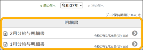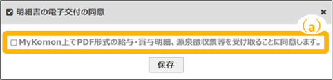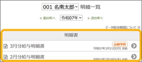 WEB明細・PDF帳票 WEB明細・PDF帳票マニュアル 目次 TOP WEB明細・PDF帳票マニュアル 初期設定 楽しい給与計算の初期設定 従業員マスタ管理の初期設定 公開設定 公開処理 公開予約 公開予約 PDF帳票 PDF帳票の登録&配布 確認方法 WEB明細の確認 WEB明細の確認 WEB明細の確認をします。 利用者権限のみ ①MyKomonにログイン (a)明細書の電子交付の同意 同意していない場合、明細は閲覧できません。 ②明細書をクリック WEB明細の確認が完了しました。 システム管理者権限 自身や他の従業員、公開予約されている明細を確認できます。 ①「WEB明細」をクリック (a)明細書の電子交付の同意 同意していない場合、明細は閲覧できません。 ②明細書をクリック WEB明細の確認が完了しました。 このページを印刷する