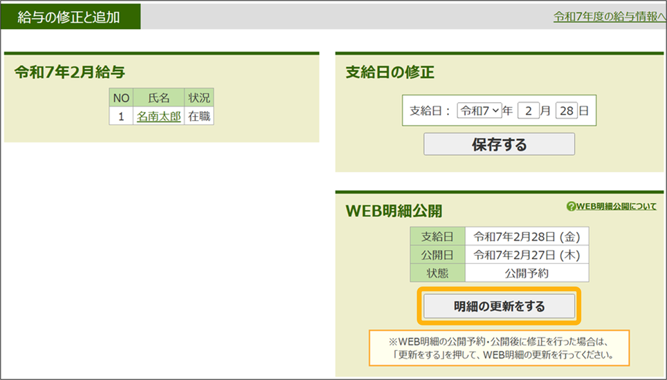 給与修正後は、「明細の更新をする」をクリックしてください。