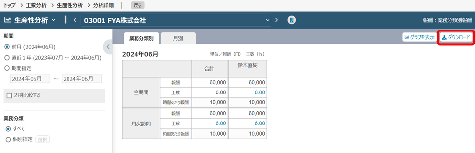 工数分析で、顧客ごとの詳細分析画面の右上にある「ダウンロード」