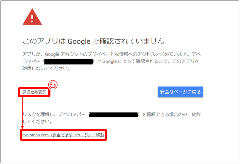 ⑤以下の画面が表示された場合、「詳細を表示」をクリックし「mykomon.com(安全ではないページ)に移動」をクリック