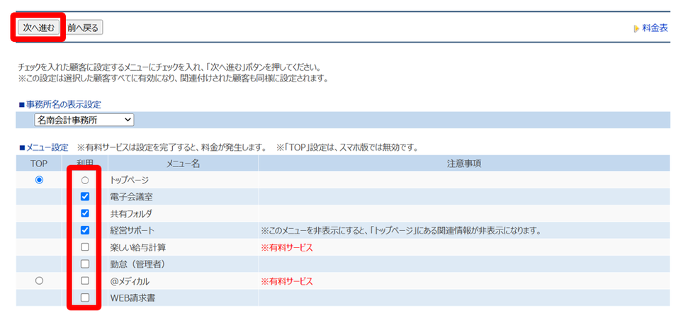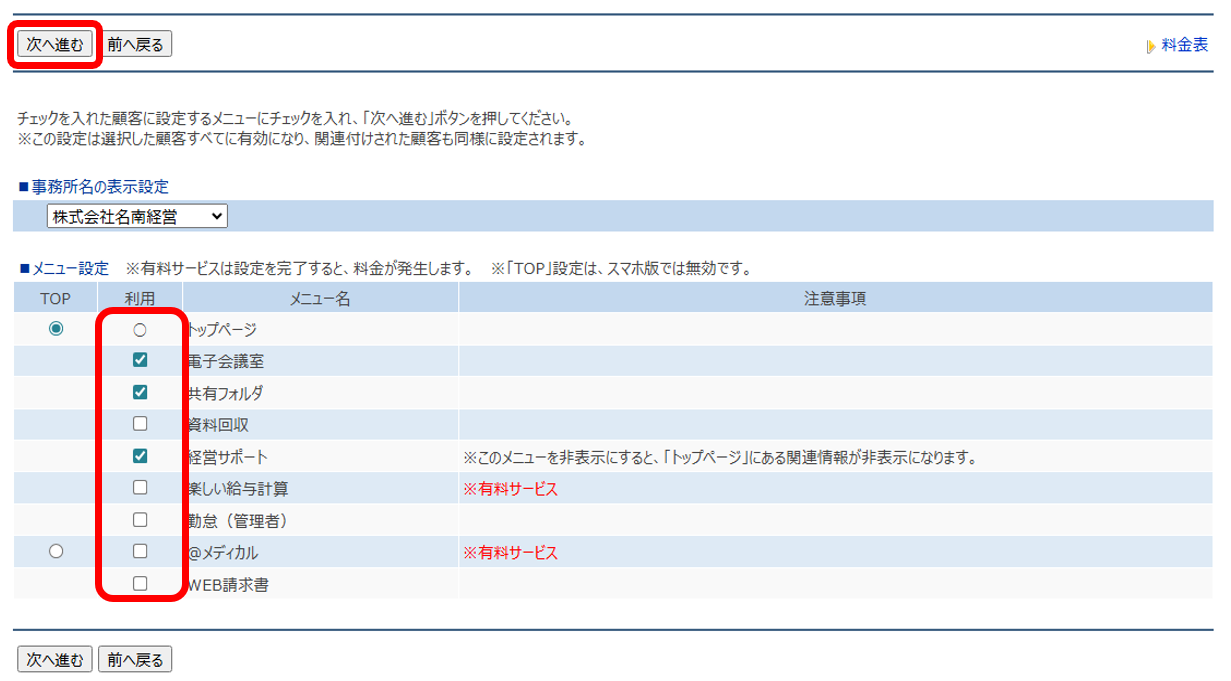 ⑥顧客の利用するメニューにチェックを入れ「次へ進む」をクリック