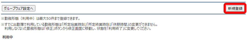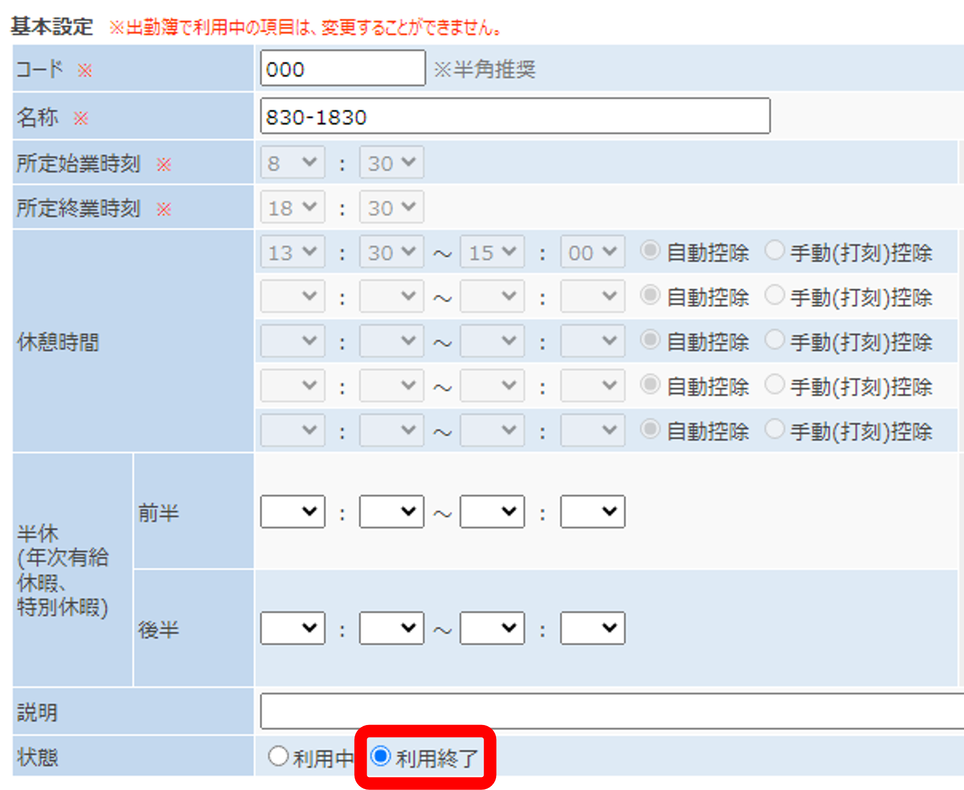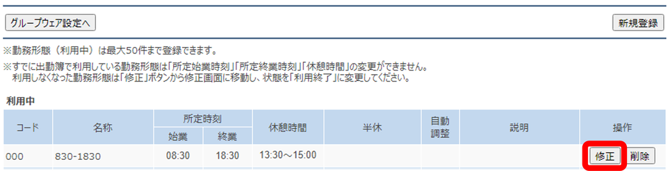 すでに利用中の勤務形態を修正することはできません。