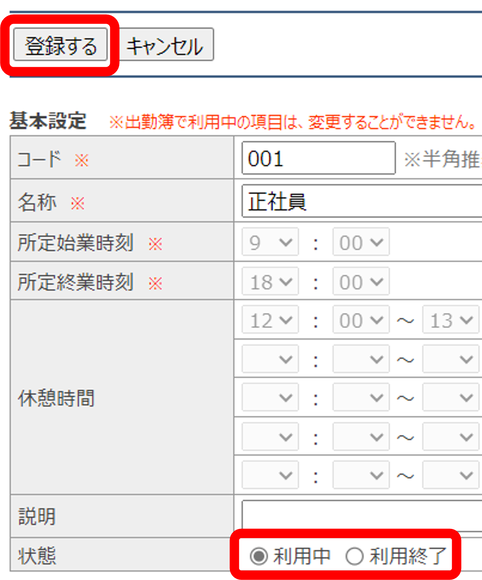 現在利用中の勤務形態を修正したいのですが、『※出勤簿で利用中のため、変更できません。 』と表示が出て修正できません。どのようにすればよいですか?