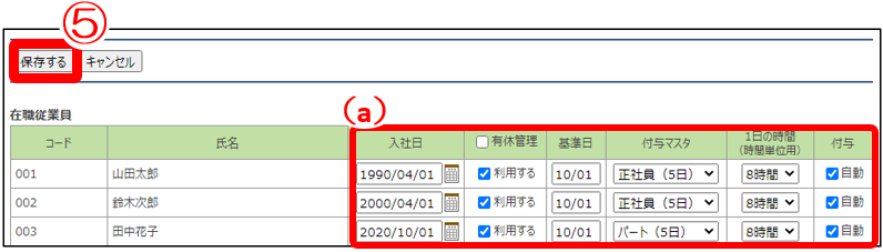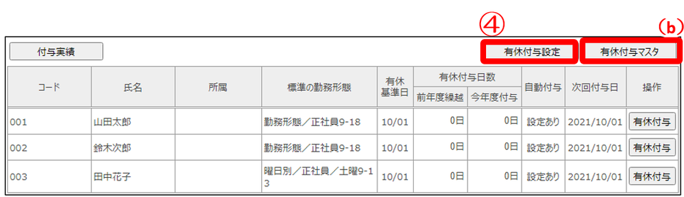 (b)有休付与マスタでは付与する有休日数のマスタを設定できます。