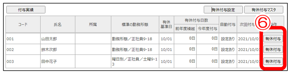 ⑥「有休付与」をクリックし、従業員ごとに有休を付与します。