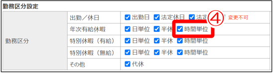 ④勤務区分設定の年次有給休暇>時間単位にチェックを入れて保存