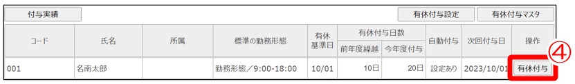 ④該当の職員の「有休付与」をクリック