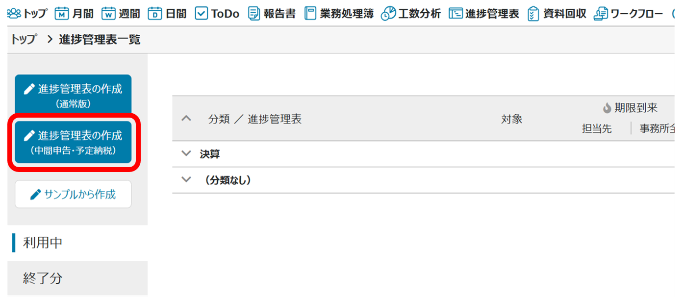 グループウェア>進捗管理表の以下のボタンから、画面の案内に沿って管理表を作成してください。