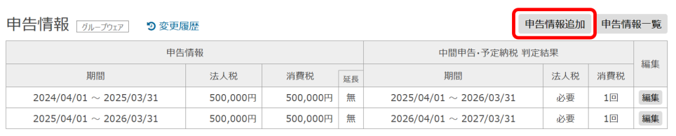 ③下にスクロールし、以下画面の「申告情報追加」ボタンから申告情報を追加