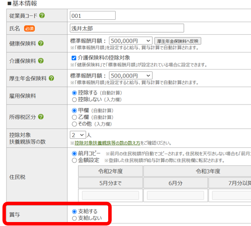 ③賞与を「支給する」に変更し、「保存する」をクリック