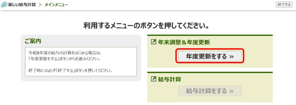 ②年末調整の結果登録が完了すると、「年度更新をする」というボタンが表示されます。
